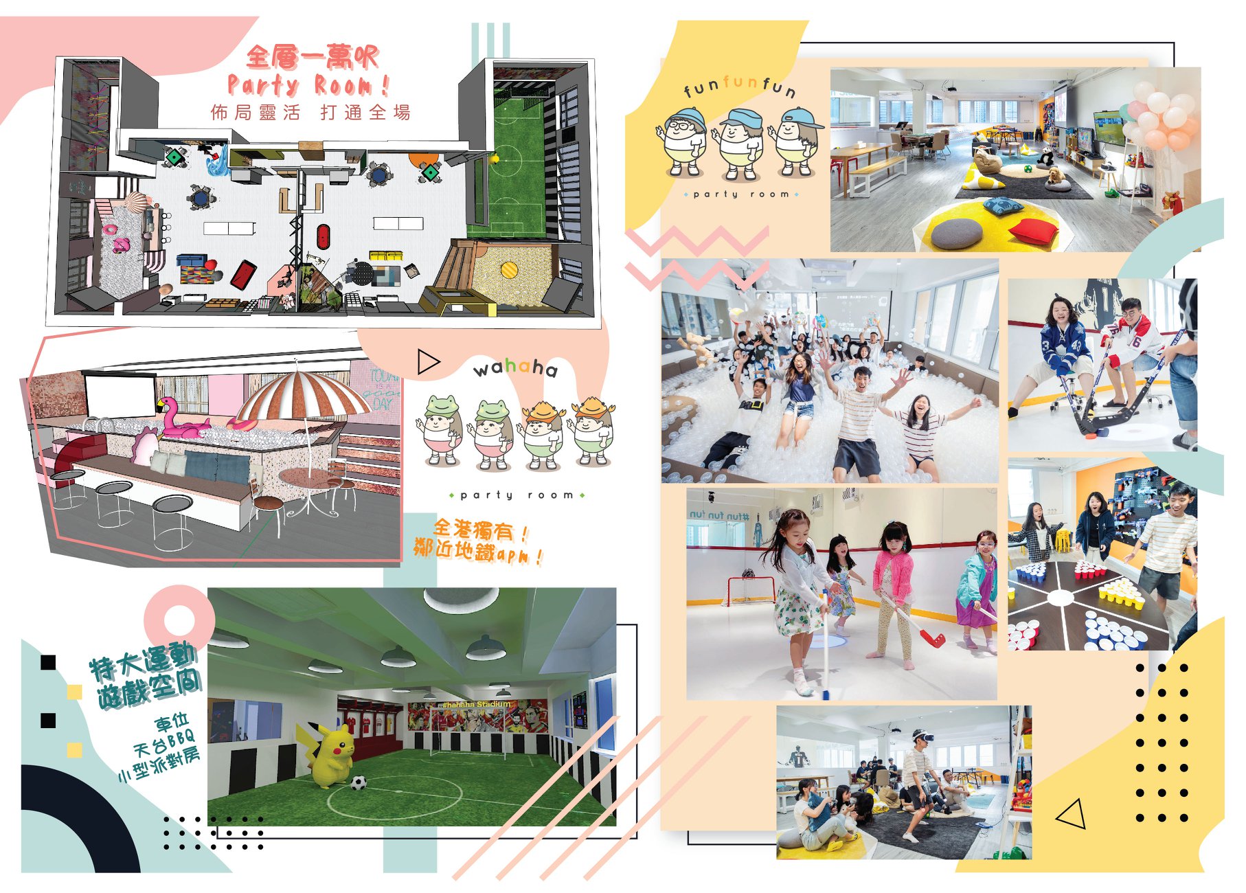 觀塘Wahaha partyroom 以全層獨家10000呎面積,場地設有兩個主題區域:繽紛綜合主題的「hahaha」和夢幻少女味濃的「wawawa」,打通包場可容納600人以上。分別音響靚,投影設備又大又多,另設4000呎天台BBQ,更鄰近觀塘地鐵站APM A2出口交通方便,適合識玩識嘆嘅你地。